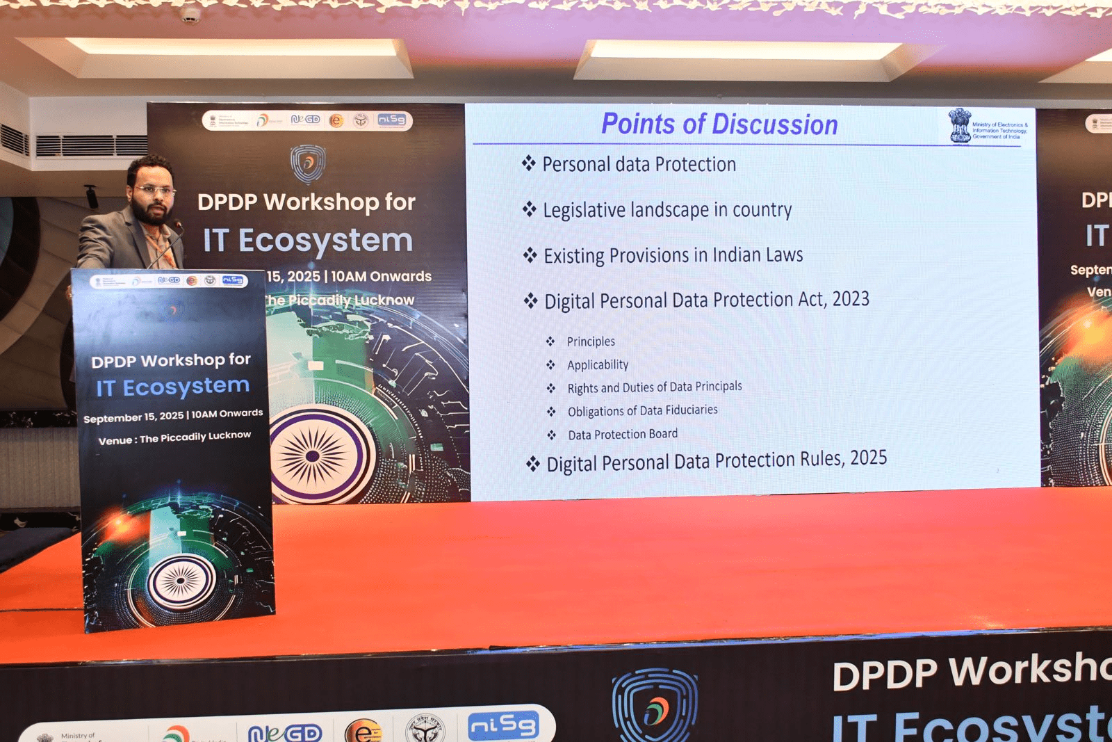 MeitY, in collaboration with NeGD and NISG, successfully conducted a one-day training program on Data Protection and Data Governance on September 15, 2025. The workshop brought together government officials, industry leaders, and data protection professionals to deepen understanding of the Digital Personal Data Protection Act, 2023 and its practical implementation. Sessions covered critical areas such as data inventory and mapping, consent management, notice requirements, rights of data principals, and technical and organisational safeguards for data protection.